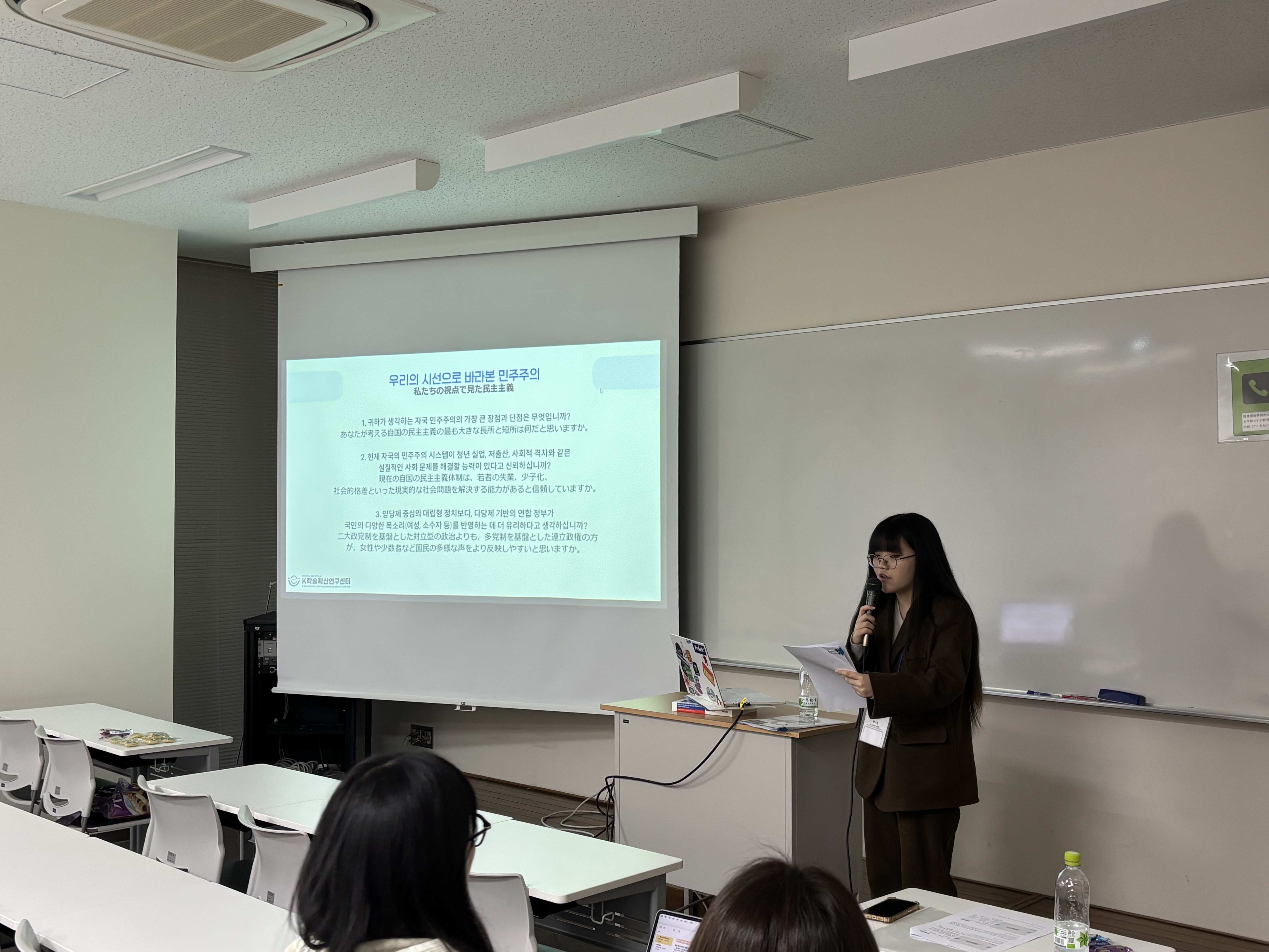 2부에서는 K학술확산연구센터 박나래 연구보조원의 토론 발제를 시작으로, 한·일 혼합 팀으로 구성된 학생들의 참여형 토론 활동이 본격적으로 진행되었다. 참가자들은 K-MOOC 강좌를 통한 사전 학습을 바탕으로 민주주의 담론 확산을 주제로 열띤 논의를 펼쳤다.